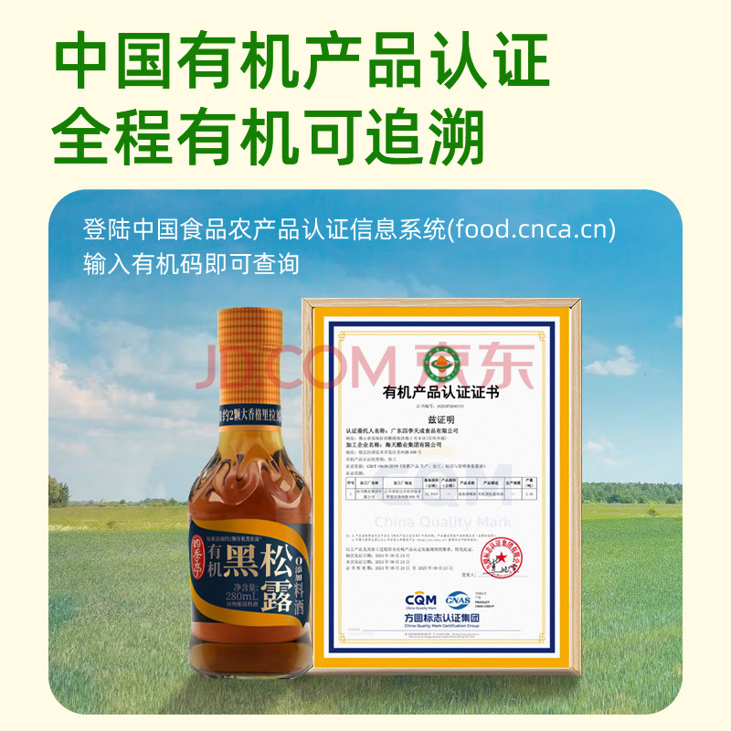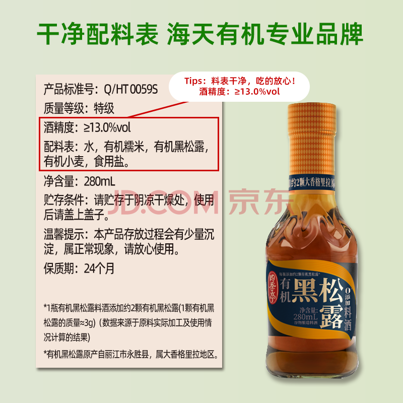商品名称:四季亭 有机黑松露料酒280ml 0添加 特级谷物酿造黄酒 焖炖香煎小炒清蒸