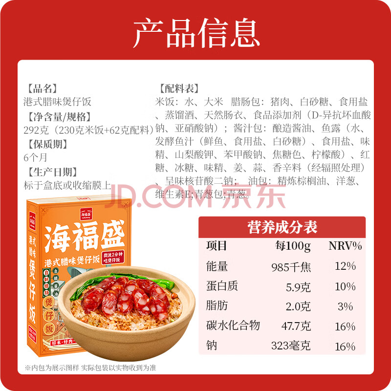 商品名称:海福盛方便速食微波自热米饭港式腊味煲仔饭292g微波2分钟即食午餐