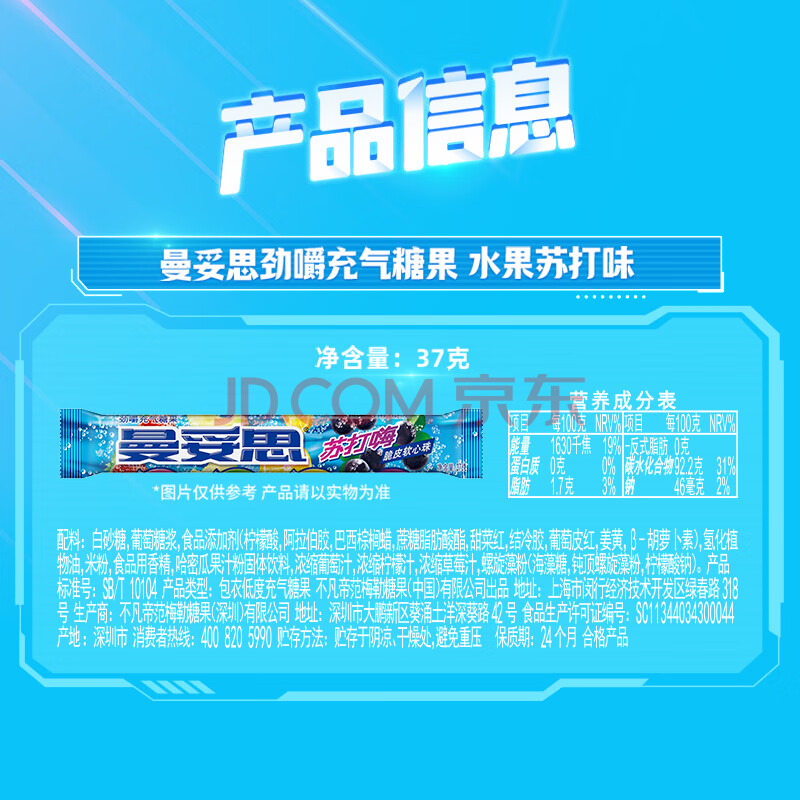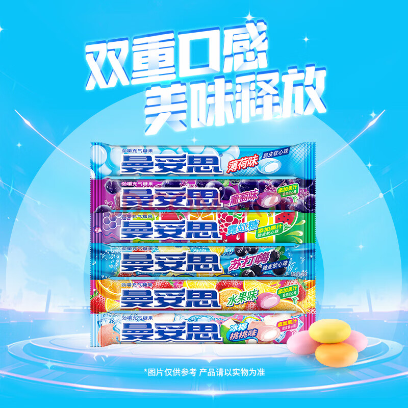 商品名称:曼妥思苏打嗨口味 劲嚼充气糖脆皮软心珠糖果37g 薄荷糖休闲零食开学礼