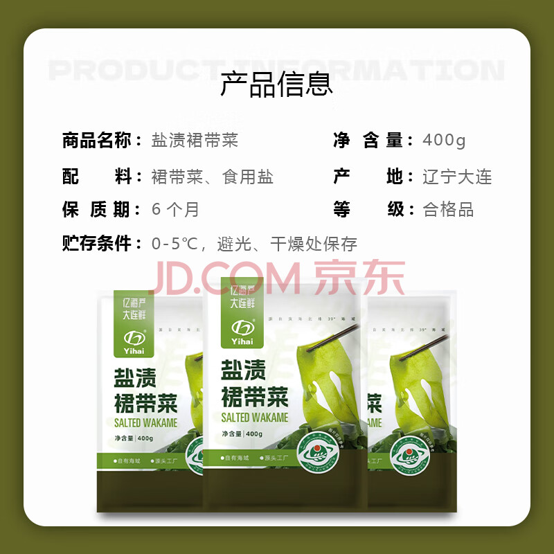 商品名称:Yihai 亿海有机盐渍裙带菜叶400g*2 大连产有机裙带菜免洗免切源头直发