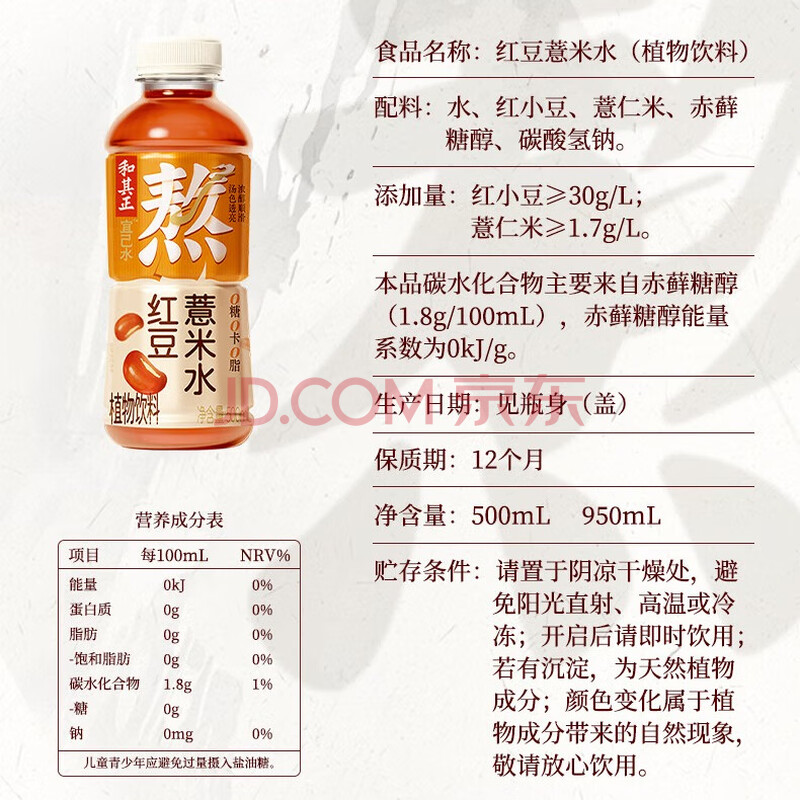 商品名称:达利园和其正宜己水 红豆薏米水0糖0卡0脂 500ml*15瓶植物饮料即饮整箱