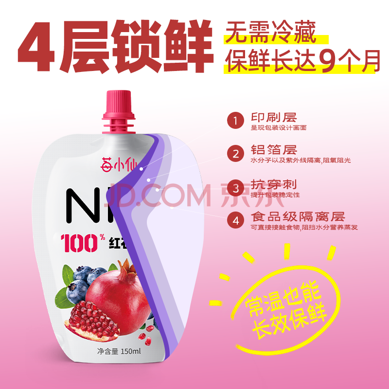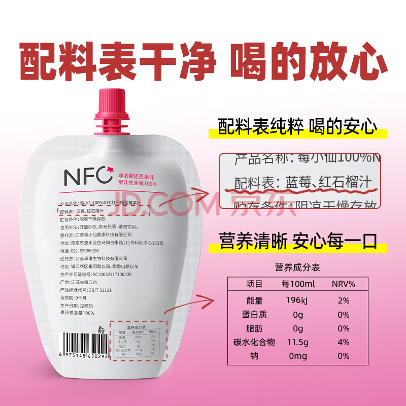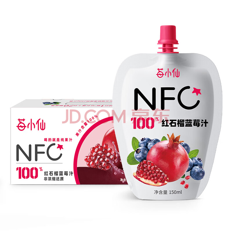 商品名称:莓小仙100%NFC石榴蓝莓汁花青素饮料150ml*10袋/箱纯果汁0添加防腐剂