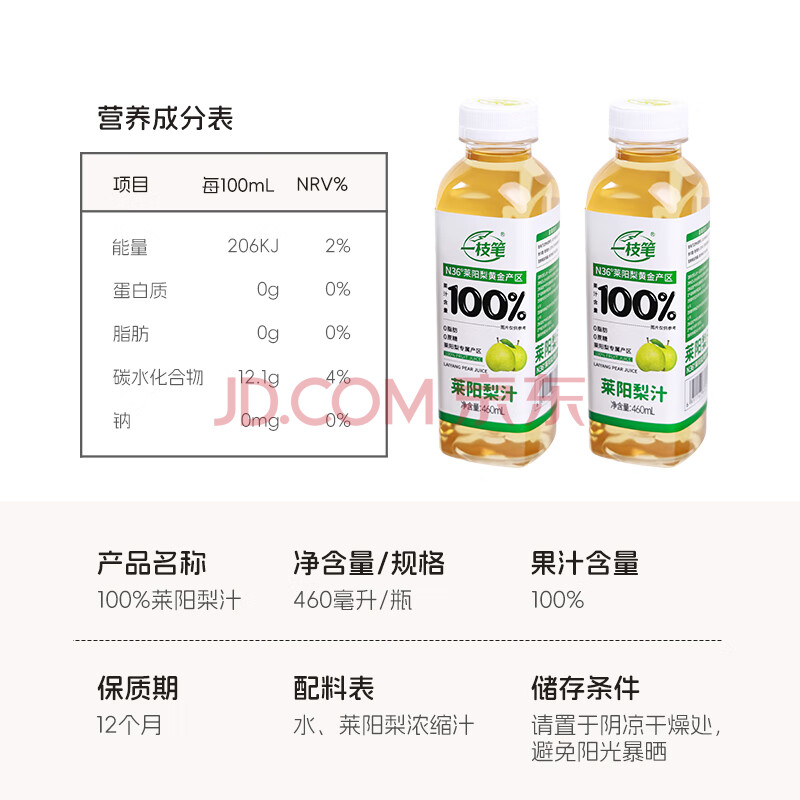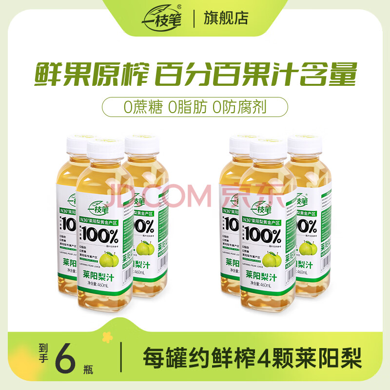 商品名称:一枝笔莱阳梨汁饮料0蔗糖100%果汁聚会瓶装健康清润饮品460ml*6瓶