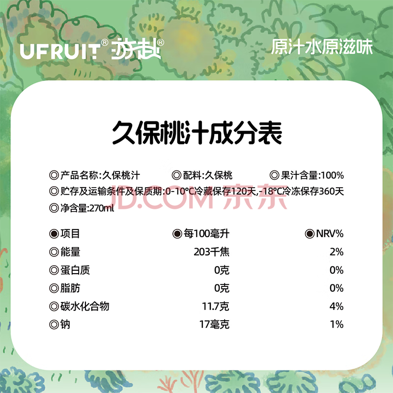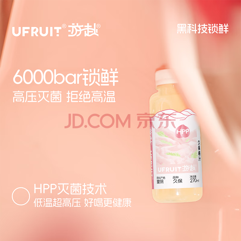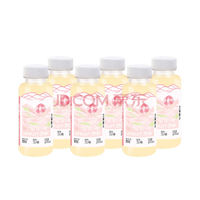 商品名称:UFRUIT游赴100%HPP冷藏果汁饮料无添加 久保桃汁270ml*6瓶 整箱装