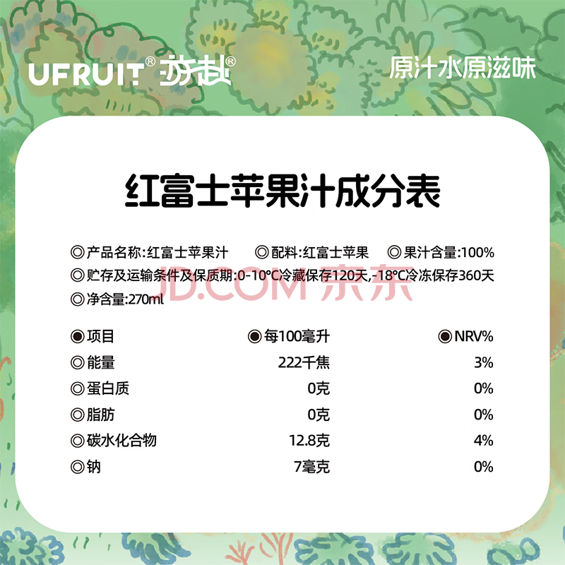 商品名称:UFRUIT游赴100%HPP果汁冷藏饮料无添加 红富士苹果汁 270ml*6瓶 整箱装