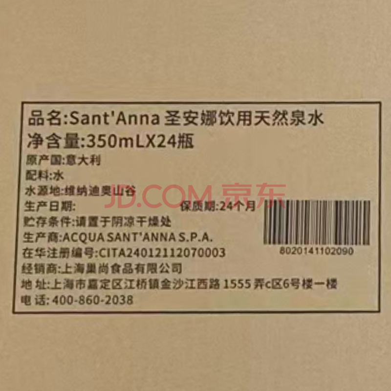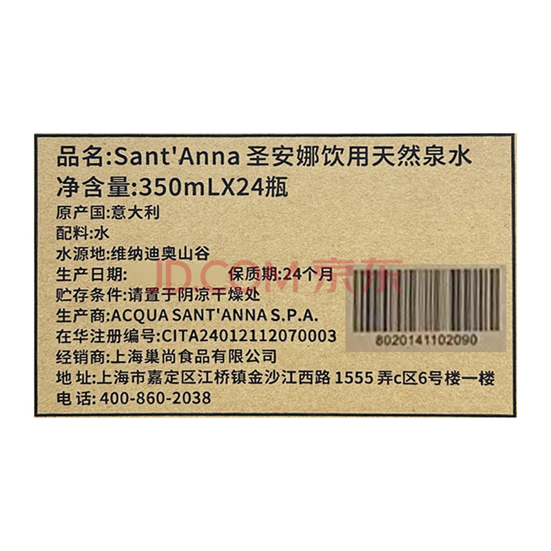 商品名称:圣安娜(Sant' Anna)天然饮用水350ml*24瓶定制外箱意大利原装进口高海拔水源天然水