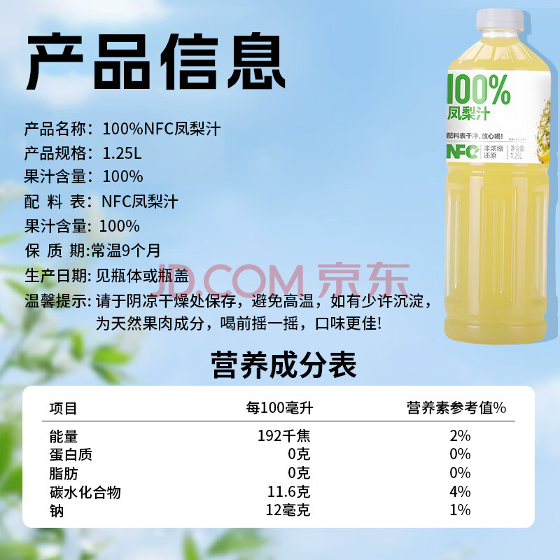 商品名称:珍珠湾 NFC凤梨汁1.25L大瓶装100%纯果汁夏日解渴解暑解腻家庭畅饮料品