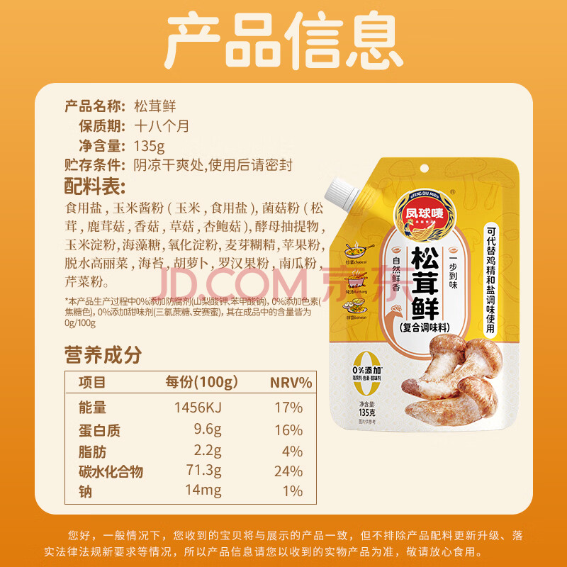 商品名称:凤球唛松茸鲜调味料135g【0添加】代替盐鸡精味精提鲜炒菜炖汤调味品