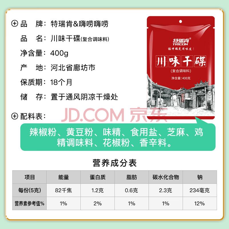 商品名称:特瑞肯(TRICON)辣椒面川味干碟香辣蘸料400g干料烧烤撒料烤肉料火锅蘸料调料