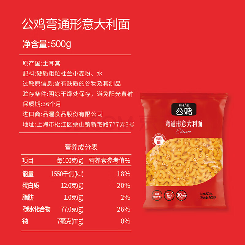 商品名称:公鸡传统意面低脂弯通形意大利面500g*2袋意粉速食儿童通心粉面条礼品