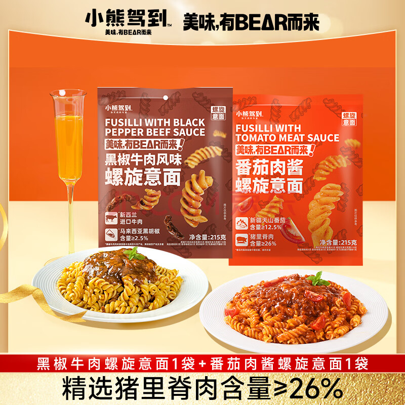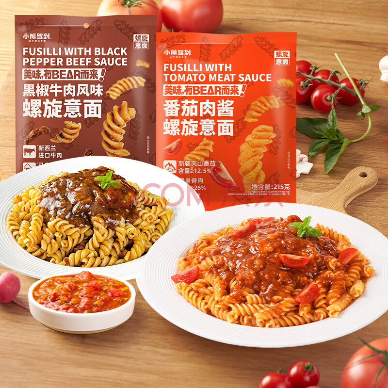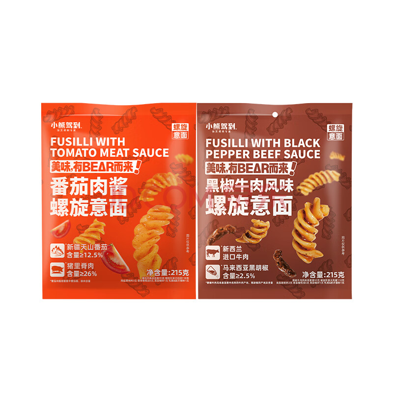 > 小熊驾到番茄肉酱+黑椒牛肉螺旋意面215g*2袋 儿童意面通心粉速食意大利面