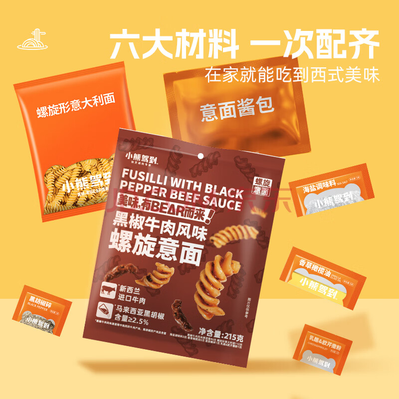 商品名称:小熊驾到番茄肉酱+黑椒牛肉螺旋意面215g*2袋 儿童意面通心粉速食意大利面