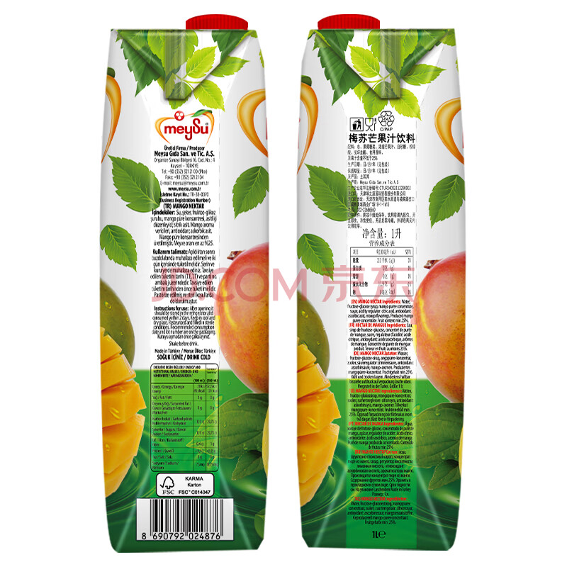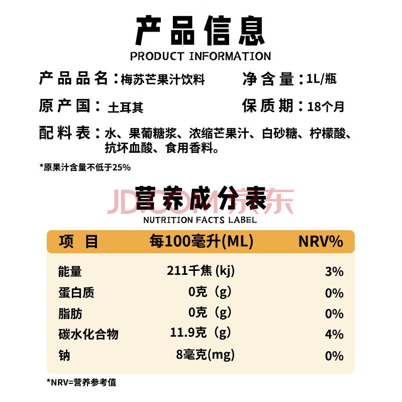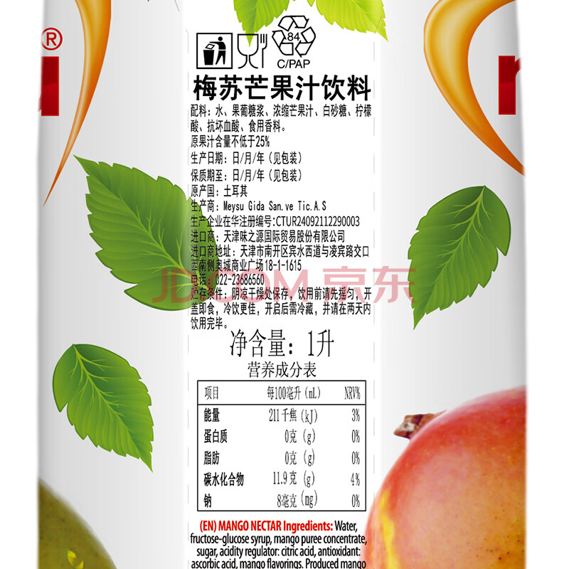 商品名称:梅苏土耳其原装进口芒果果汁饮料1L*4瓶果蔬饮品 聚会聚餐 囤年货送礼
