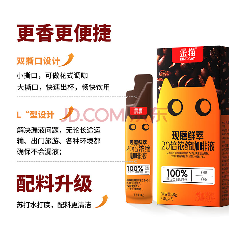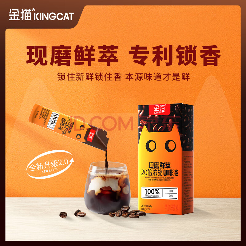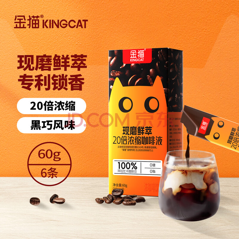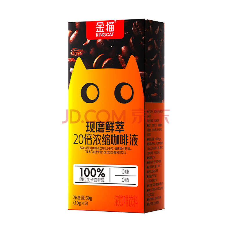 商品名称:KINGCAT COFFEE金猫现磨鲜萃20倍浓缩咖啡液10g*6条 0糖0脂速溶咖啡