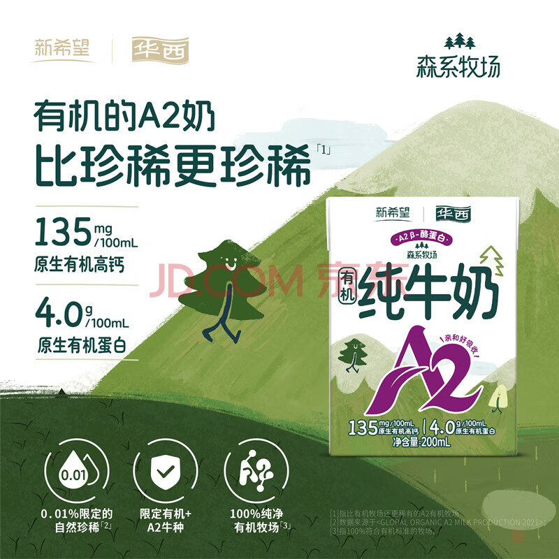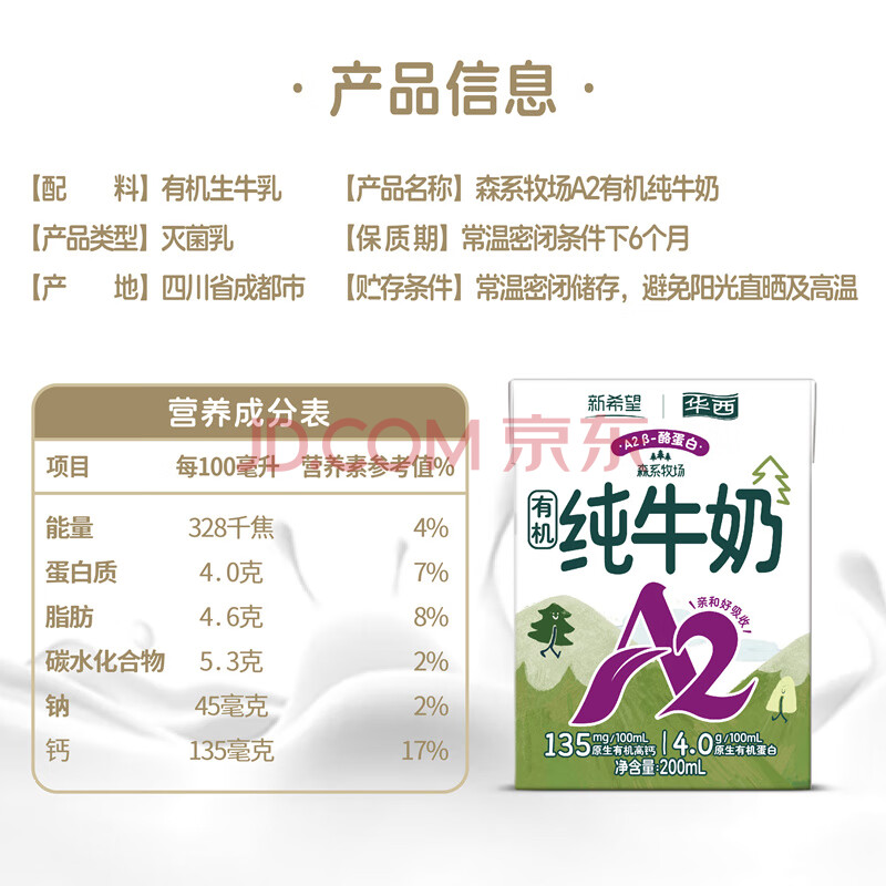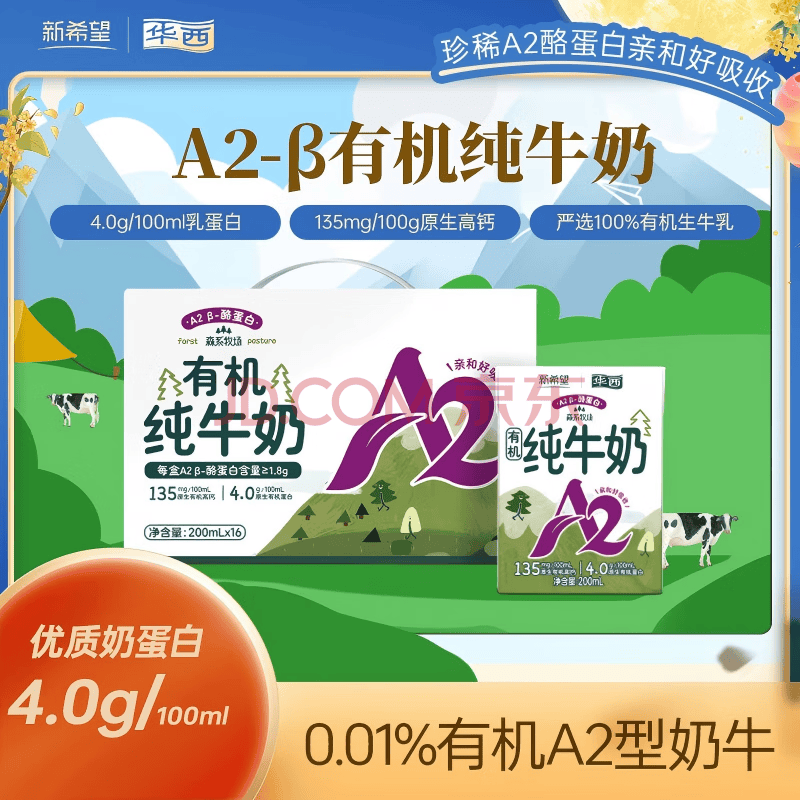 商品名称:华西新希望A2儿童有机纯牛奶200ml*16盒整箱送礼