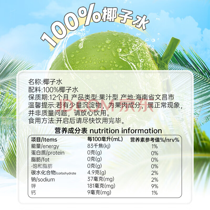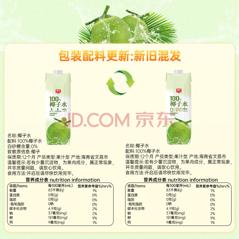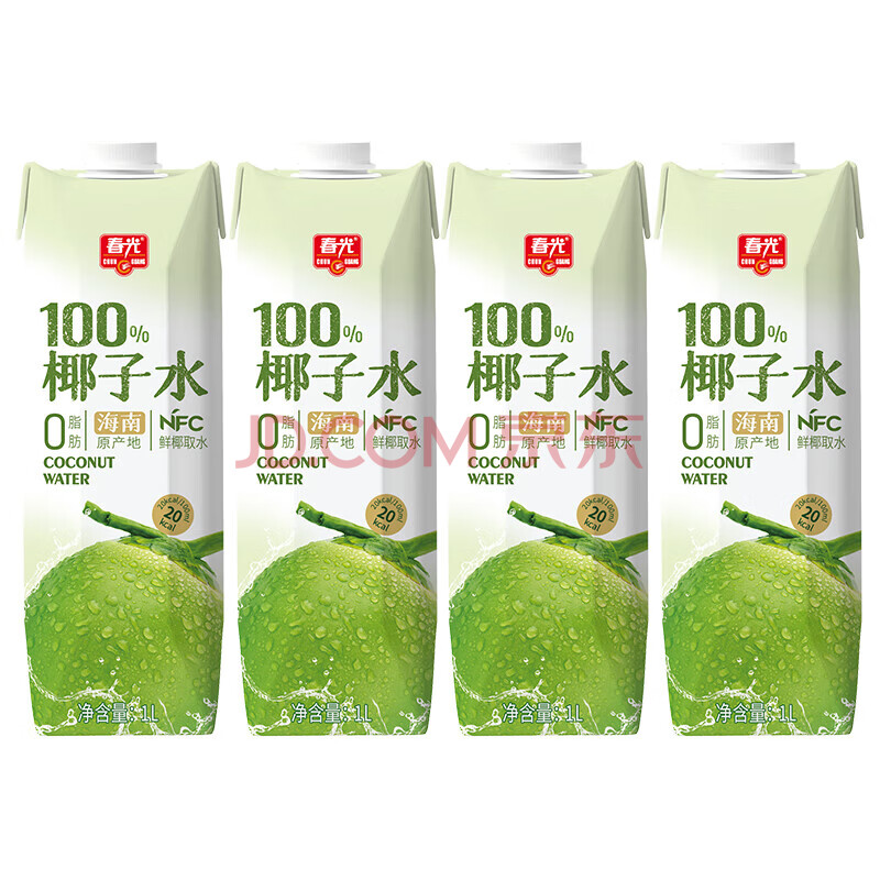 商品名称:春光100%椰子水1L*4盒散装 饮料NFC椰青水椰子汁 海南特产椰子水商务