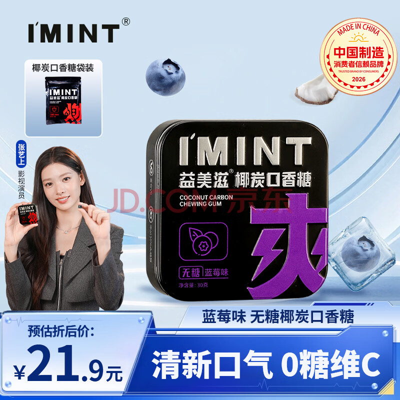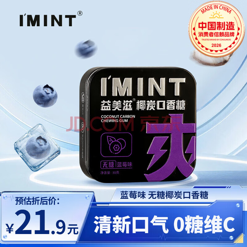 商品名称:I'MINT益美滋 无糖椰碳口香糖 30g/盒 清新口气薄荷糖果 休闲零食 蓝莓味
