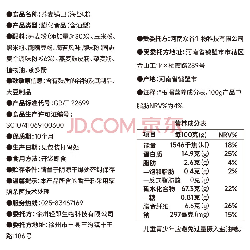 商品名称:小鸡收腹低脂非油炸荞麦锅巴25g*30苦荞片0无糖精卡脆片减解馋肥零食食品