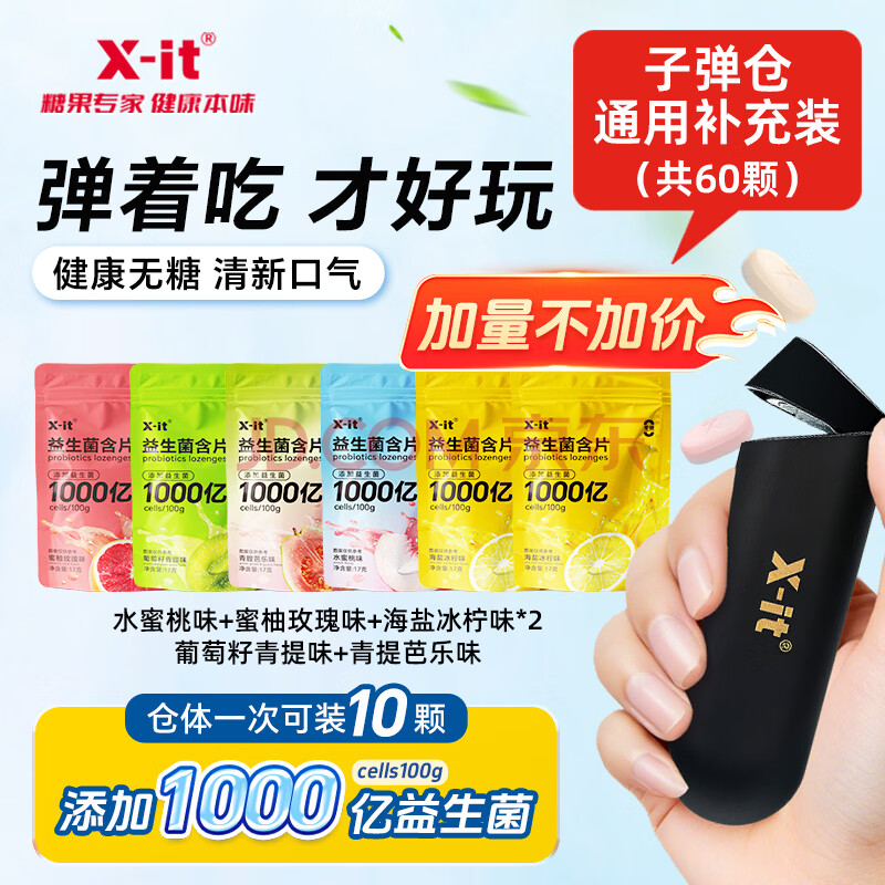 > X-IT无糖薄荷糖弹射益生菌糖体补充装通用版清新口气糖果6袋60片102g