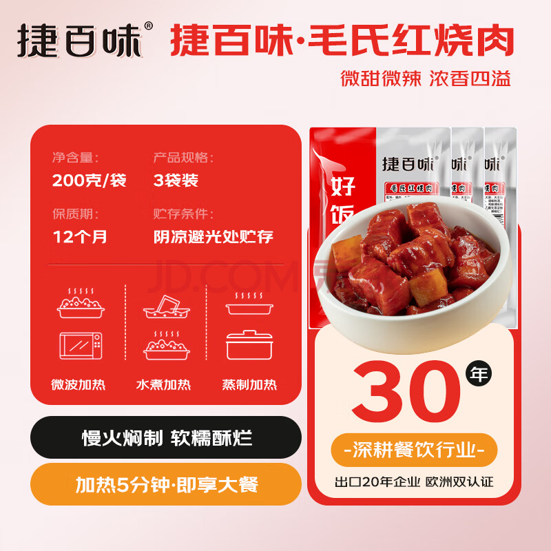 商品名称:谷言常温毛氏红烧肉200g*3袋 加热即食 捷百味常温