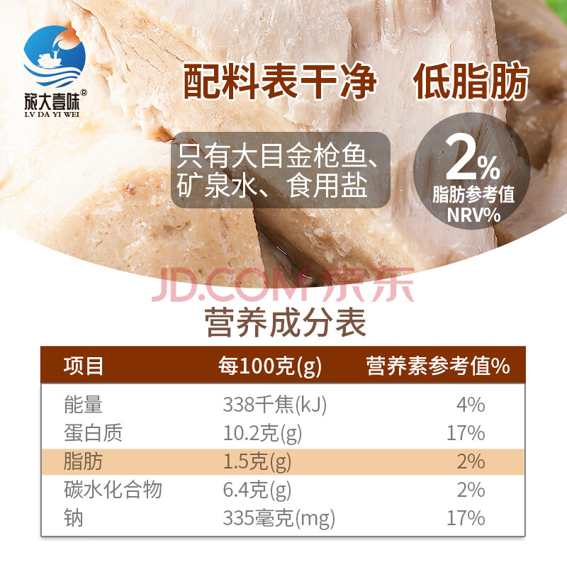 商品名称:旅大壹味矿泉水水浸 低脂 大目金枪鱼罐头150g*2罐健身沙拉吞拿鱼罐头