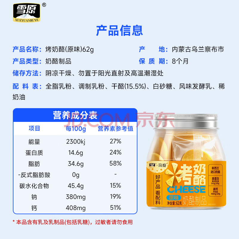 商品名称:雪原内蒙特产烤奶酪(原味)62g 奶酪经典高钙高蛋白 奶酪奶条奶制品