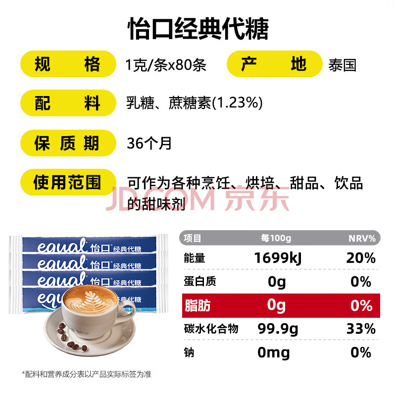 商品名称:怡口(EQUAL)泰国进口经典代糖1g*80条 乳糖咖啡奶茶伴侣速溶便携