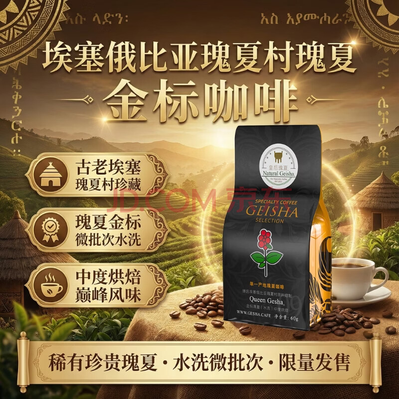 商品名称:皇后瑰夏咖啡豆进口埃塞俄比亚瑰夏村金标水洗瑰夏咖啡原料中度烘焙60g
