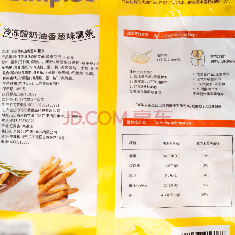 商品名称:辛普劳冷冻酸奶油香葱味薯条 225g*2袋 带皮薯条 调味薯条 葱香薯条