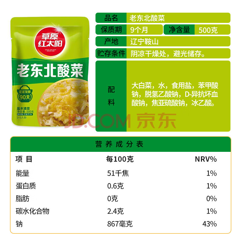 商品名称:草原红太阳老东北酸菜500g 正宗东北酸菜酸菜芯饺子馅料炖粉条