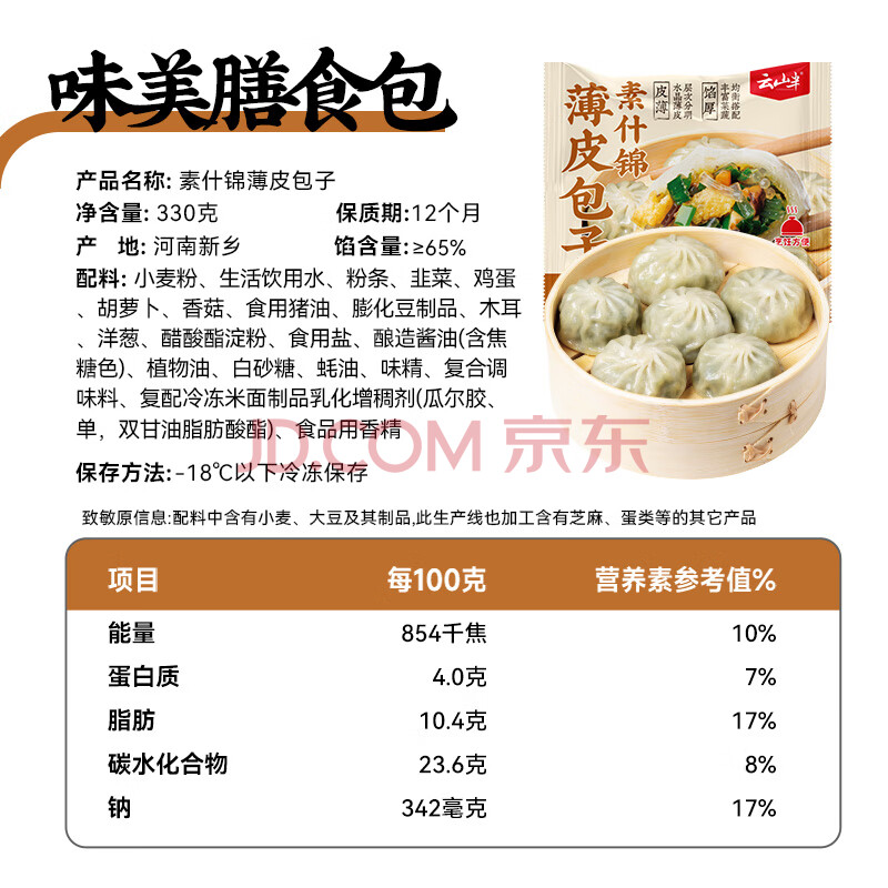 商品名称:云山半什锦馅水晶薄皮素包330g*4袋 共40个 半成品早餐包子 速食面点