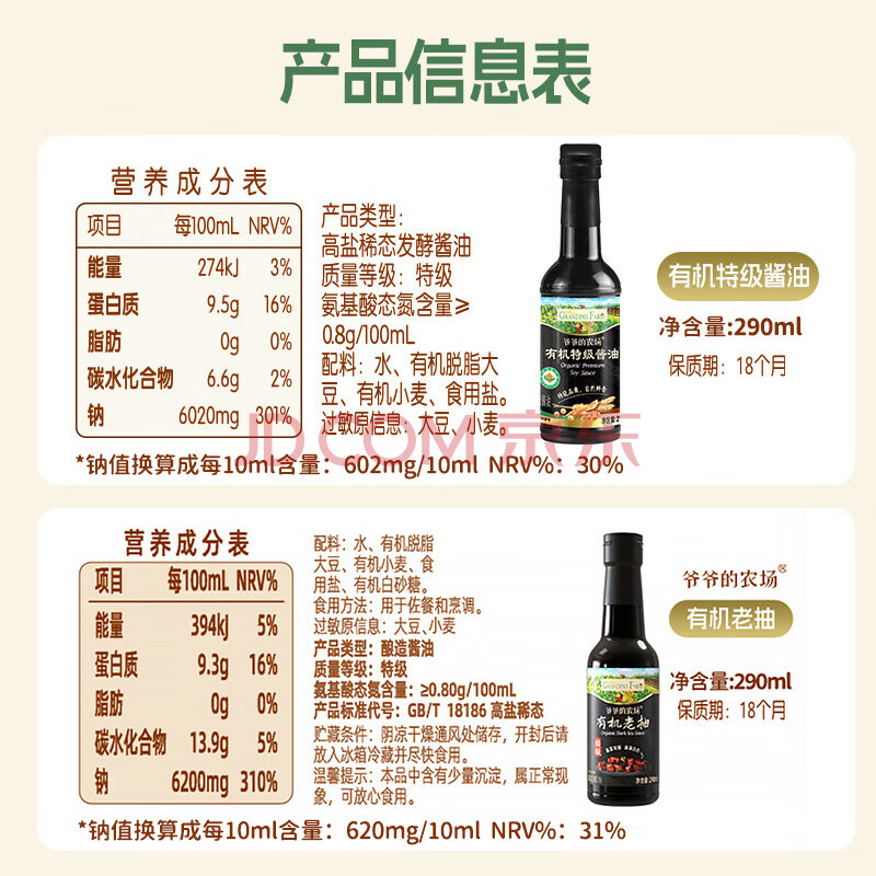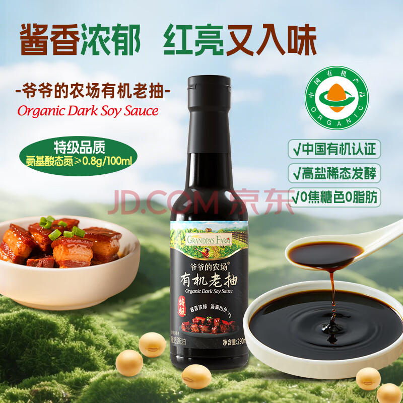 商品名称:爷爷的农场有机老抽+生抽290ml小瓶酿造大豆酱油 拒绝色素特级调味红烧酱油