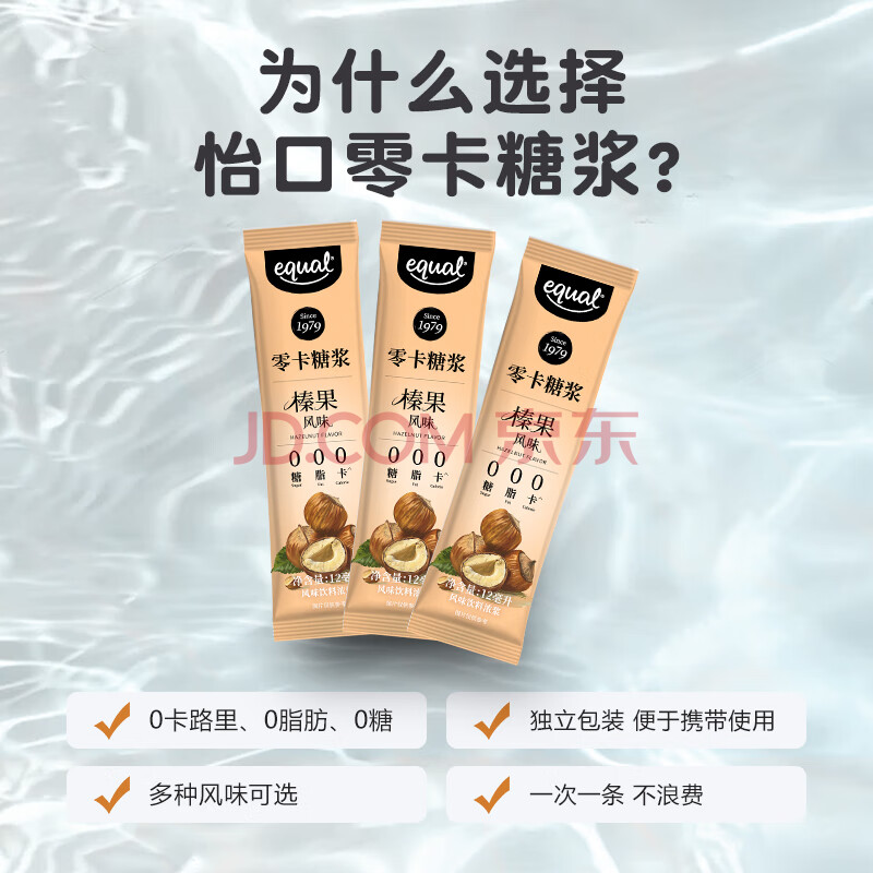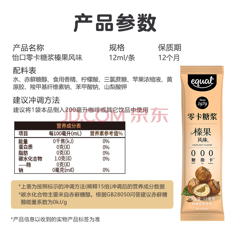 商品名称:怡口(EQUAL)零卡糖浆榛果风味12ml*25条【0脂肪0热量】咖啡伴侣烘焙代糖原料