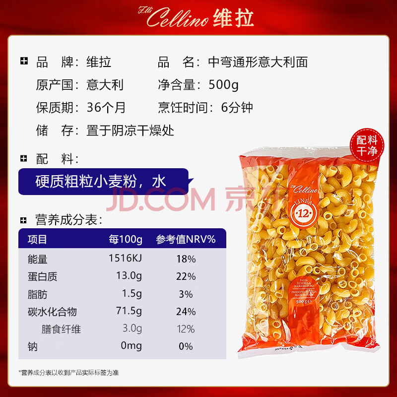 商品名称:维拉意大利进口中弯通形意大利面500g 意面意粉速食高蛋白低脂通心粉