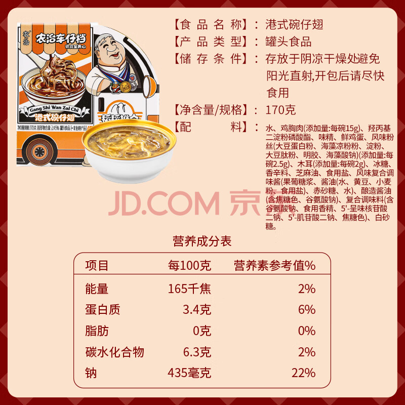 商品名称:农治速食汤港式碗仔翅170g鸡丝木耳粉丝羮加热即食香港街头小吃
