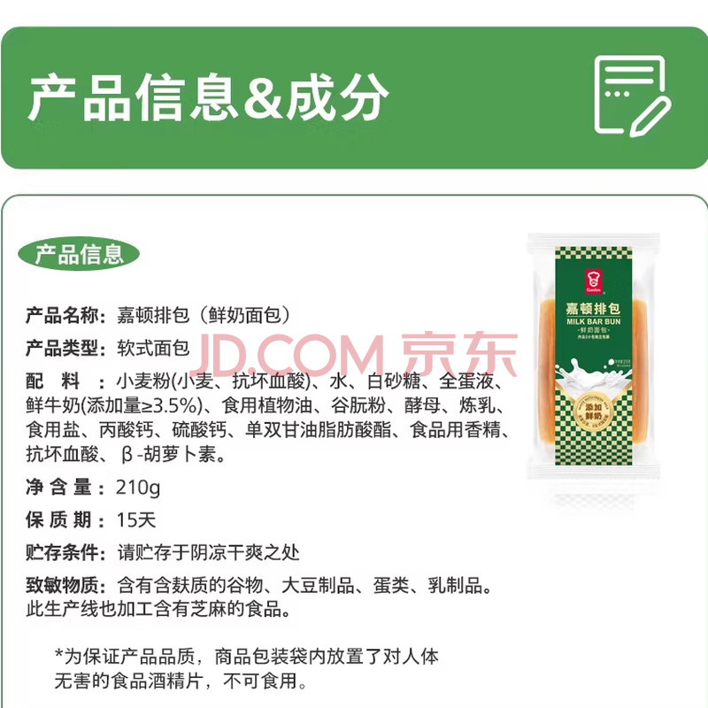 商品名称:嘉顿排包新鲜奶味面包营养早餐面包下午茶糕点210g*3袋【源头直发】