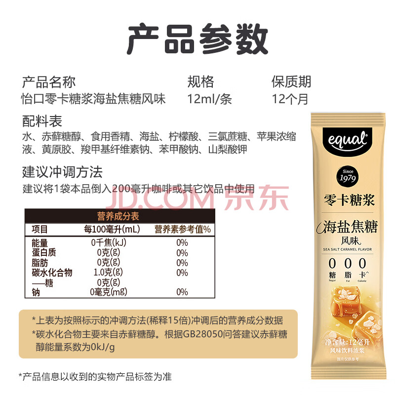 商品名称:怡口(Equal)(EQUAL)零卡糖浆海盐焦糖风味12ml*25条【0脂肪0热量】咖啡伴侣