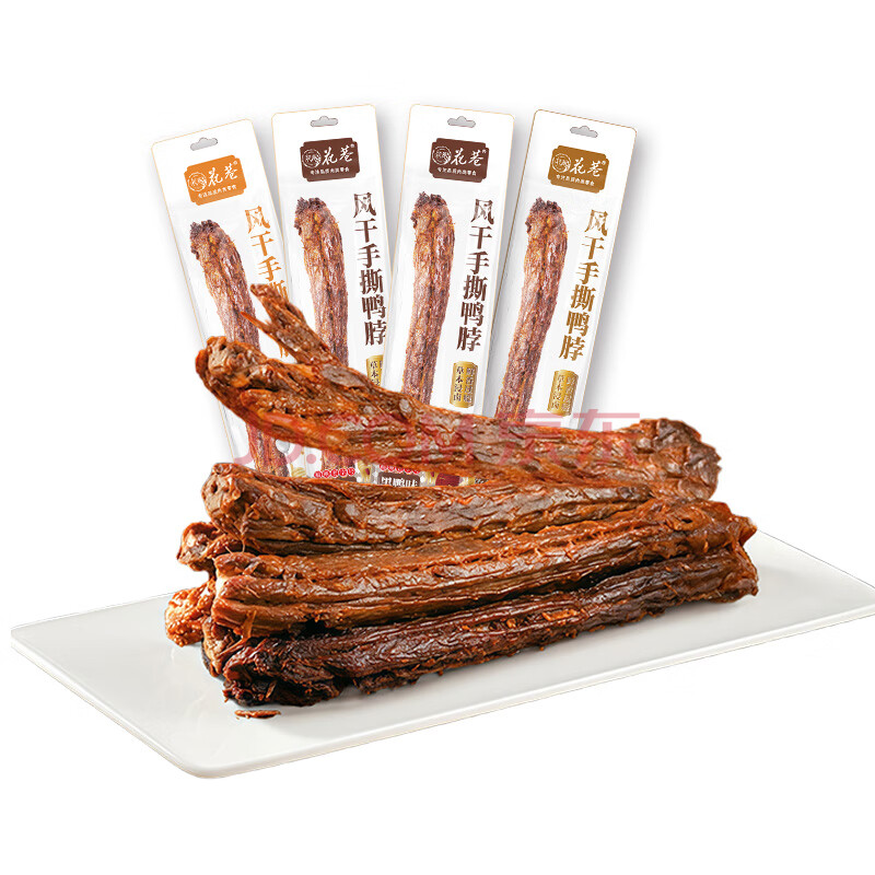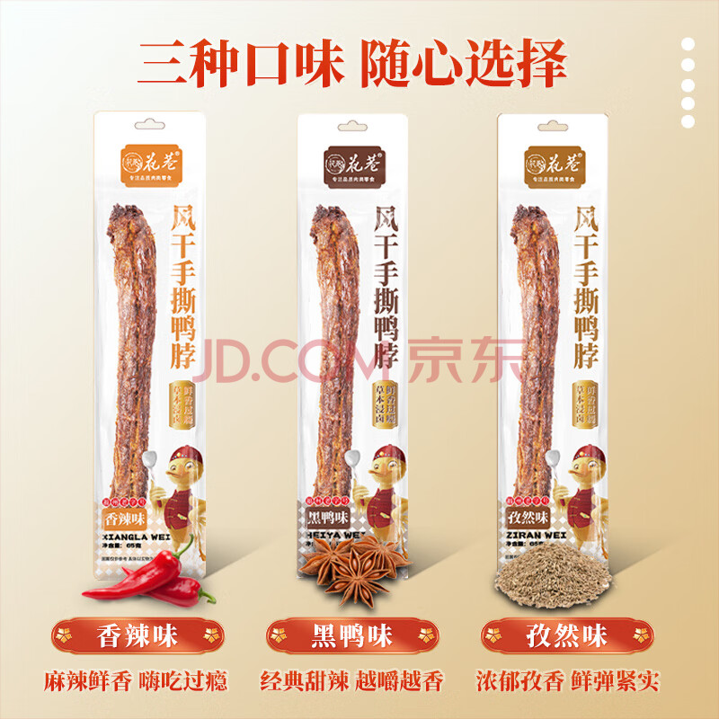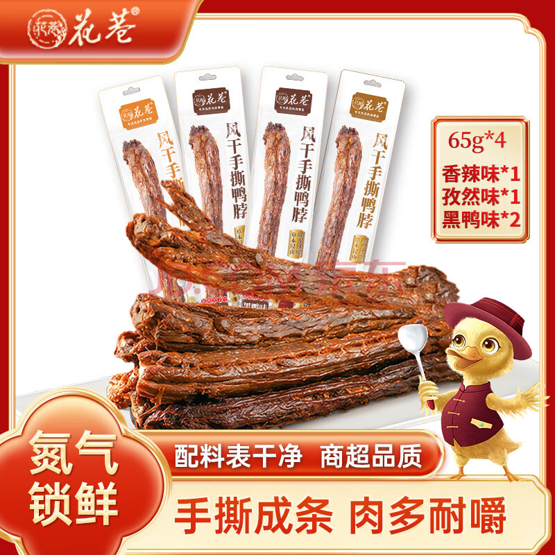 > 花巷手撕风干鸭脖65克*4根 黑*2+辣*1+孜*1 整根 休闲零食 鸭肉鸭货