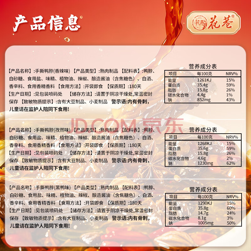 商品名称:花巷手撕风干鸭脖65克*4根 黑*2+辣*1+孜*1 整根 休闲零食 鸭肉鸭货