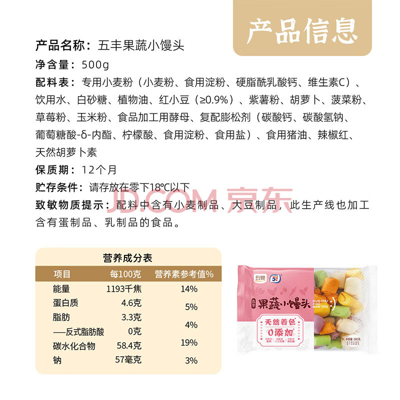 商品名称:五丰果蔬小馒头500g*2 140只儿童早餐半成品绿色无添加五种果蔬豆沙供
