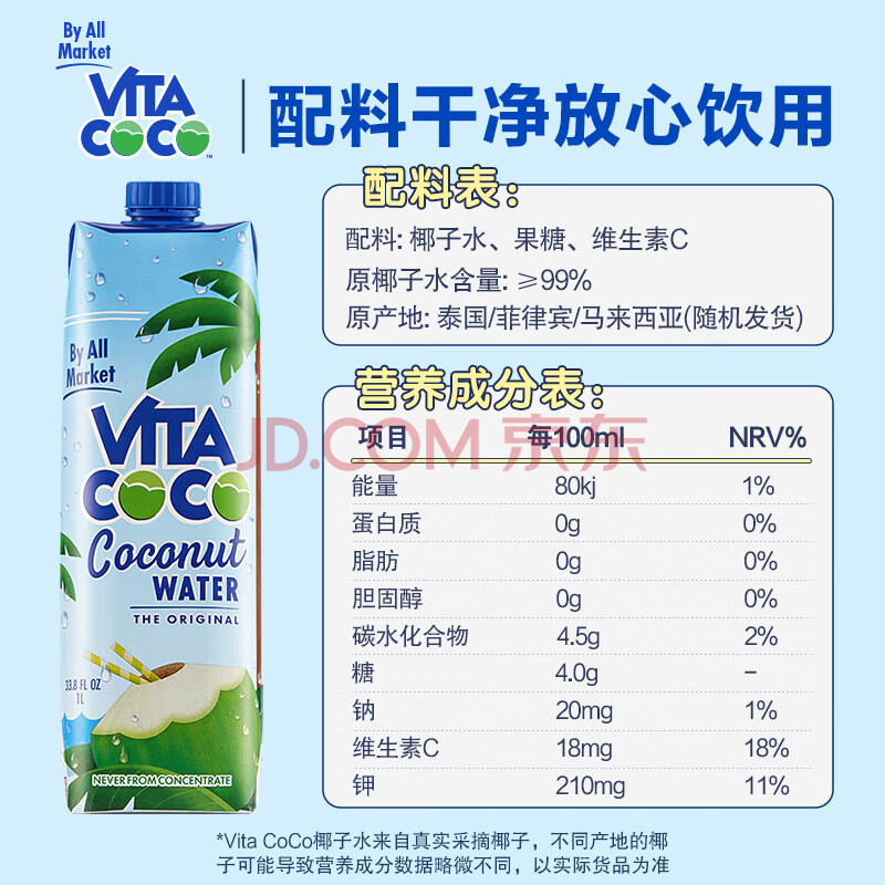 商品名称:唯他可可(Vita Coco)NFC椰子水 椰汁饮料低糖低卡含电解质原装进口果汁1升/瓶