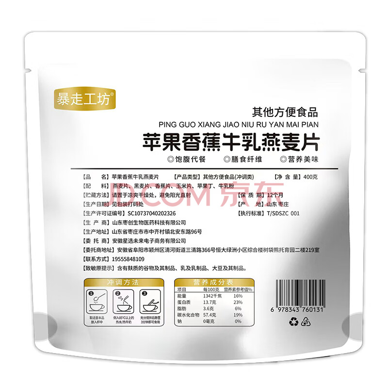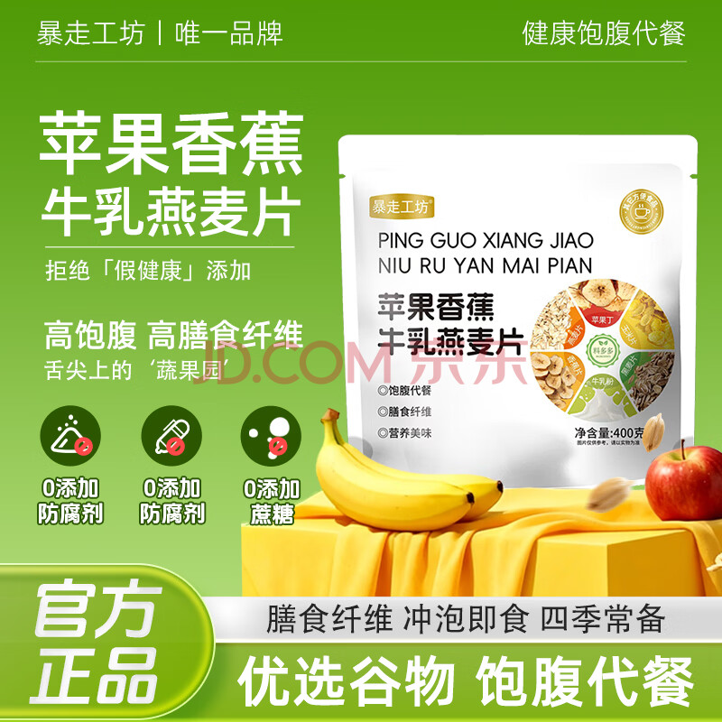 商品名称:胖村农暴走工坊苹果香蕉牛乳燕麦片400克水果麦片膳食纤维0蔗糖添加代餐