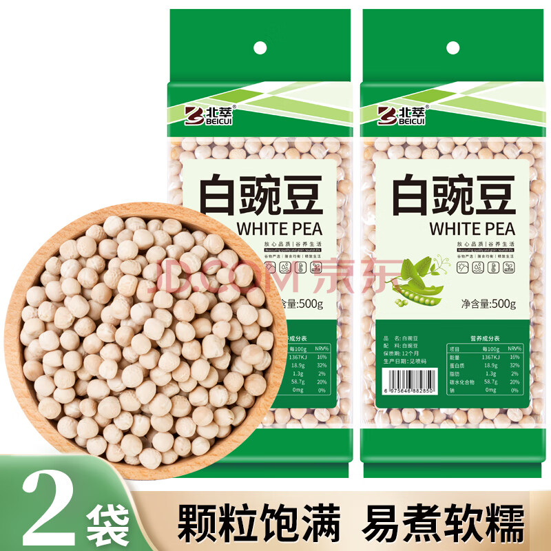 商品名称:北萃 白豌豆 500g*2袋 干生豌豆粒 可发豆芽煮粥 真空包装
