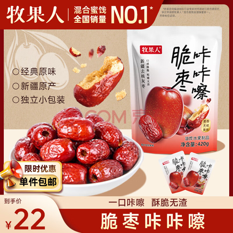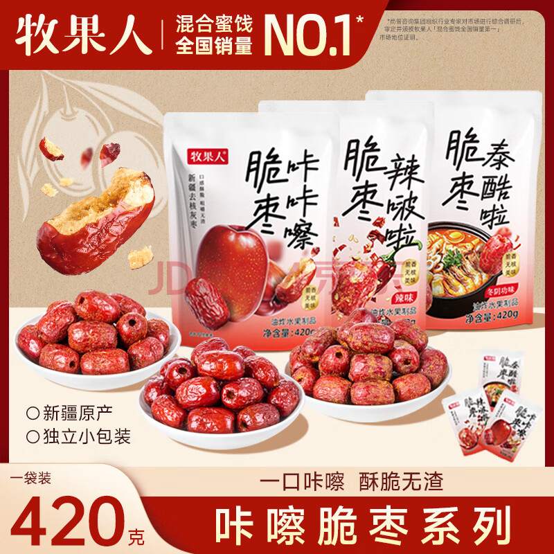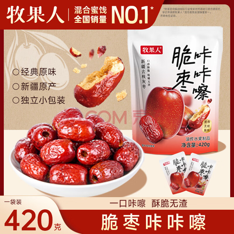 商品名称:牧果人脆枣咔咔嚓420g 香酥原味脆枣红枣干无核灰枣新疆特产休闲零食