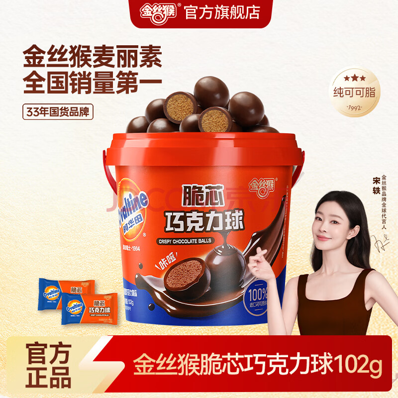 商品名称:金丝猴阿华田脆芯巧克力球 102g 纯可可脂 香醇夹心麦丽素 休闲零食