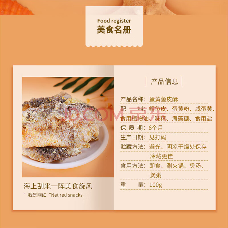 商品名称:海边人 高蛋白海鲜零食蛋黄鱼皮酥100g青岛特产即食鱼酥休闲零食小吃