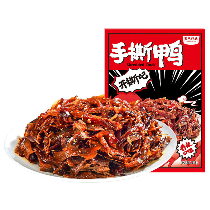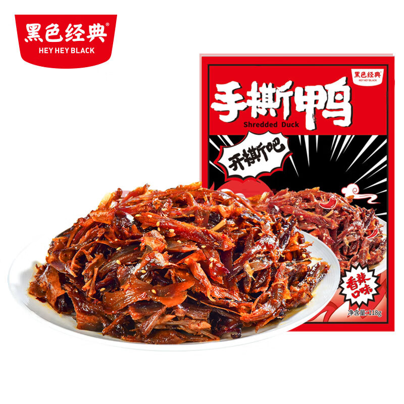 商品名称:黑色经典手撕鸭肉香辣味118g 休闲零食湖南特产酱板鸭肉干肉脯卤味小吃