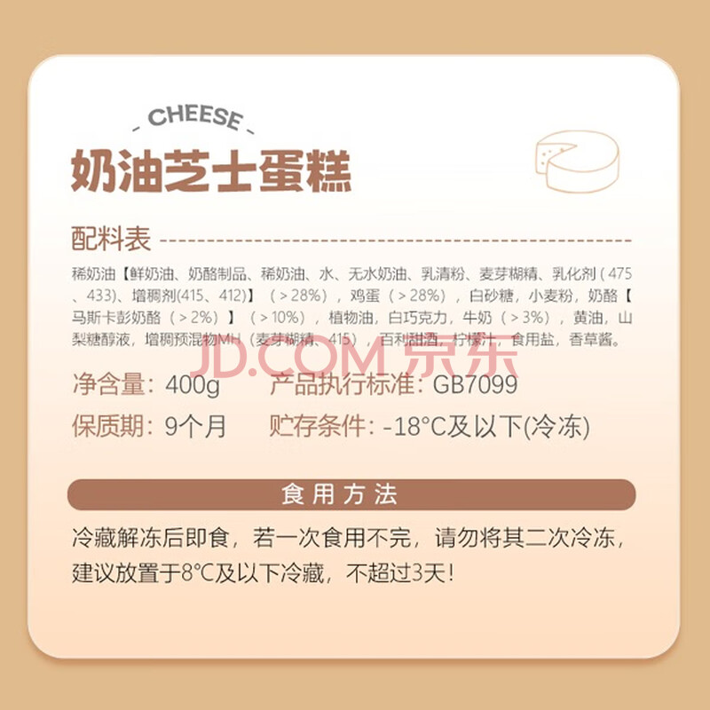 商品名称:趣尝鲜趣尝鲜奶油芝士蛋糕 400g(约6寸) 下午茶甜品甜点冷冻蛋糕
