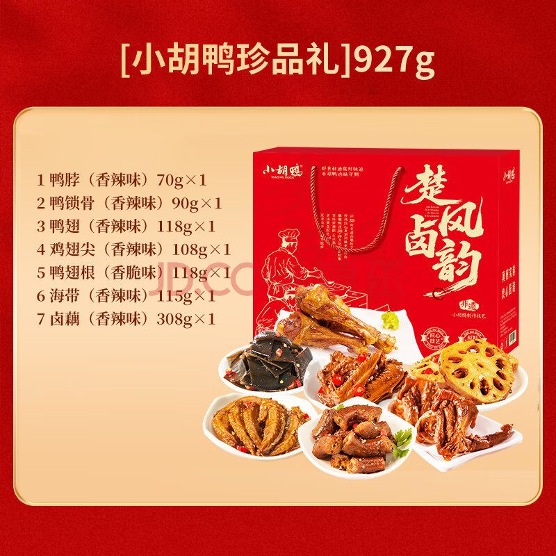 商品名称:小胡鸭零食大礼包小胡鸭珍品礼927g鸭脖鸭翅鸭锁骨鸭爪海带等真空便携装