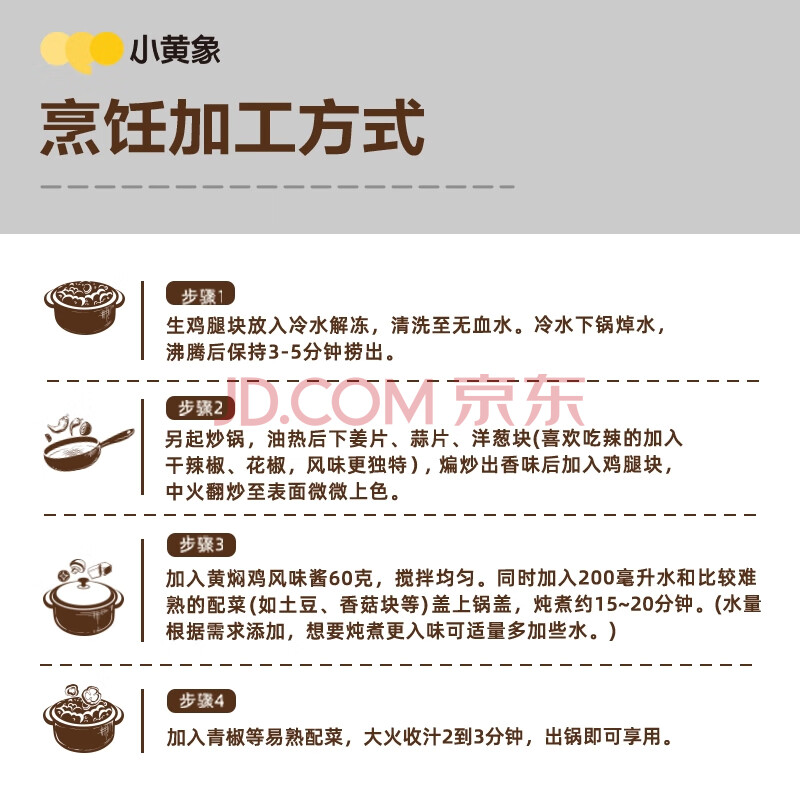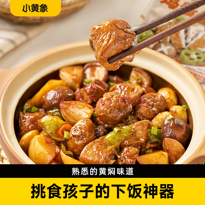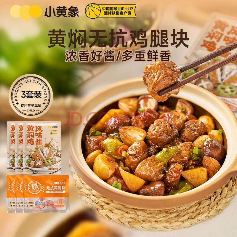 商品名称:小黄象无抗黄焖鸡腿块1230g(无抗鸡腿块350g*3+黄焖鸡风味酱60g*3)